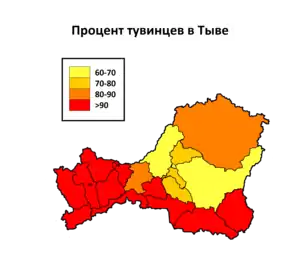 | Тувинцы | 80,0 % | 79,0 % | 85,0 % | 57,0 % | 58,6 % | 60,5 % | 64,3 % | 77,0 % | 82,0 % |