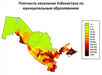 Население республики размещено по территории неравномерно, и по средней плотности населения Узбекистан находится впереди ряда стран СНГ, опережая по этому показателю остальные республики Центральной Азии. В связи с быстрым ростом численности населения плотность его на каждый квадратный километр территории на начало 1993 года выросла по сравнению с 1959 годом почти в 3 раза и составляет в среднем 48,5 человека.
