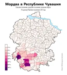 Мордва в Республике Чувашия по городским и сельским поселениям, в %, перепись 2010 г.