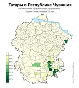 Татары компактно проживают в Батыревском, Комсомольском, Шемуршинском и Яльчикском районах. В Чувашии 24 татарских, 5 смешанных населённых пунктов. Имеется 19 школ с преподаванием татарского языка, 24 мечети (на 1997). Работают Всетатарский общественный центр Чувашии (Чебоксары, с 1992), Татарский общественно-культурный центр Чувашии (с. Шыгырдан Батыревского района, с 1993). Издаётся газета «Вакыт (газета Чувашии)» (с 1996). Выступают Татарский народный театр (д. Полевые Бикшики Батыревского района, с 1965), фольклорно-эстрадный ансамбль «Мишар» (с. Урмаево Комсомольского района)[66].