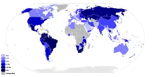 Абсолютное число убийств во всём мире составило в 2000 году, по оценкам, более 500 000[9]. Относительные показатели числа убийств в разных странах существенно отличаются. В большинстве развитых стран совершается 1—4 убийства на 100 000 человек населения; самые низкие показатели наблюдаются в Японии, Ирландии и Исландии (около 0,5); выше среднего этот показатель в США (5,5)[10]. В России в 2009 году было совершено 17 681 убийство, что соответствует уровню 12,5 на 100 000 населения[11]. В развивающихся странах уровень убийств ещё выше, он может достигать 40—50 на 100 000 населения или даже более высоких значений.