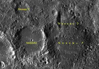 ![]() Снимок зонда Lunar Reconnaissance Orbiter. Кратер Нассау в центре снимка, в левой части снимка кратер Ван де Грааф. | |