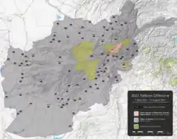 Наступление «Талибана» (2021) — активная наступательная операция против правительственных сил Афганистана, начатая боевиками террористической организации «Талибан» 1 мая 2021 года, в связи с объявлением об окончательном уходе американских войск из страны[19]. К 14 августа талибы взяли под контроль 90 % всей территории страны, а 15 августа 2021 года заняли столицу, Кабул, и захватили власть в стране. Президент Афганистана Ашраф Гани бежал из страны[20].