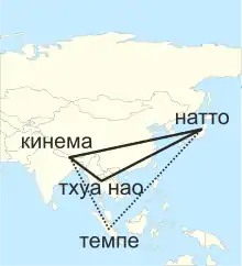 Точное время появления натто неизвестно, однако его точно употребляли в XI веке[2]. По одной из теорий, он появился в поздний Дзёмон (время начала культивации риса и, как следствие, появления рисовой соломы) или ранний Яёй (время распространения соевых бобов). Японский этнобиолог Сасукэ Накао предположил, что натто, гималайская кинема и индонезийское темпе образуют вершины «треугольника несолёных ферментированных блюд из сои», заключив, что эти культуры вышли из китайской Юньнани[2]. В «треугольнике» Накао находятся также корейский чхонгукчан, пепок с севера Мьянмы, камбоджийский sieng, тайский тхуа нао[2]. Индийский пищевой технолог Джоти Пракаш Таманг исключал темпе из этого перечисления, так как его заквашивают грибком Rhizopus oligosporus, а остальные продукты — микроорганизмами рода Бациллы[2]. В то же время японский пищевой микробиолог Саюки Никкуни отмечала, что натто — лёгкий в приготовлении продукт, и, следовательно, его могли изобрести в нескольких местах независимо друг от друга[3].