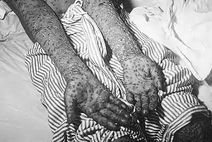 ![]() Девочка из Бангладеш, больная натуральной оспой (1973 год). О полном уничтожении оспы в Бангладеш было объявлено в декабре 1977 года, когда Всемирная организация здравоохранения официально подтвердила этот факт | |