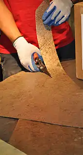 Если оборотную сторону каменного слоя укрепить клеящим составом и хлопковой подложкой, то получится очень гибкий каменный шпон (Eco Stone) толщиной около 0,8 мм. Тонкие пластины легко разрезаются, гнутся и могут быть наклеены практически на любой материал, поэтому гибкий сланец Eco Stone можно использовать для облицовки сложных архитектурных форм, мебели, изготовления сувенирной продукции, декорирования одежды, обуви, тюнинга салонов автомобилей.