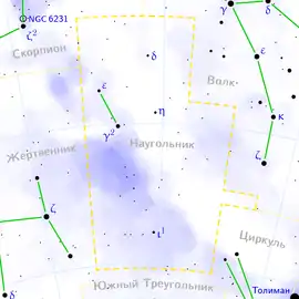 Науго́льник (лат. Norma) — созвездие южного полушария неба, лежит к юго-востоку от Скорпиона, севернее Южного Треугольника, восточнее Жертвенника, северо-западнее Циркуля и западнее Волка. Через него проходят обе ветви Млечного Пути, но эта область неба бедна яркими звёздами. Созвездие не содержит звёзд ярче 4,0 визуальной звёздной величины, 42 звезды, видимые невооружённым глазом, площадь на небе 165,3 квадратного градуса. Наилучшие условия для наблюдений в мае — июне, частично наблюдается в южных районах России (к югу от 48 С.Ш). В созвездии Наугольник наблюдается гравитационная аномалия Великий аттрактор, объект, имеющий массу ста тысяч масс Млечного Пути, который является, вероятно, огромным галактическим сверхскоплением[1].