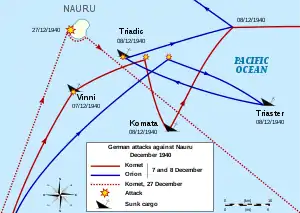 Вторая мировая война затронула Науру в 1940 году. В это время два немецких вспомогательных крейсера, замаскированных под грузовые суда, отправились к острову. Их целью было расстроить поставки фосфоритов. «Орион», «Комет» и корабль снабжения «Кумерланд» были направлены сюда с целью уничтожения транспортной инфраструктуры. Вследствие плохих погодных условий они не смогли совершить высадку десанта на острове, но им удалось затопить несколько торговых судов. 27 декабря «Комет» подошёл к острову, и, несмотря на то, что высадка не состоялась, расстроил горнодобывающие работы и скрылся невредимым. Администратором острова и командиром его обороны был Фредерик Ройден Чалмерс, бывший полковник австралийской армии и участник Первой мировой войны[6].