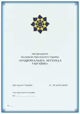 Отличие Президента Украины «Национальная легенда Украины» — знак отличия Президента Украины, установленный для награждения граждан за выдающиеся личные заслуги в становлении независимой Украины, укреплении её государственности, защите Отечества и служении украинскому народу, весомый вклад в развитие национальной экономики, науки , образования, культуры, искусства, спорта, здравоохранения, а также за активную благотворительную и общественную деятельность.