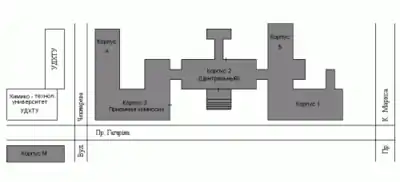 - Корпус 1 — вход по ул. Гагарина, справа от центрального входа