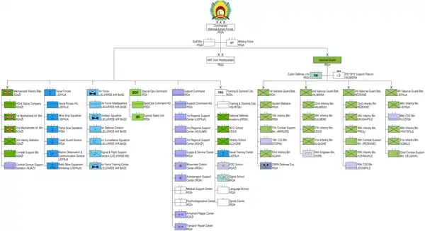 Национальные вооружённые силы Латвии состоят из регулярных сил, территориальных сил (национальной гвардии) и резерва НВС. В военное время или при чрезвычайном положении в подчинение НВС должны войти Управление безопасности Банка Латвии и Государственная пограничная служба Латвии.