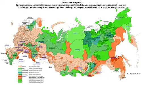 Для представителей народов, находящихся в ситуации национальных меньшинств, с начала 1990-х годов в ряде субъектов Российской Федерации образованы национальные административно-территориальные единицы. Указана доля титульного народа в населении района: