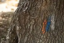 Дорожная метка, обозначающая Национальный Израильский тракт, на стволе дуба в Нижней Галилее