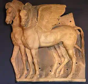 В отдельном зале представлен главный экспонат коллекции музея — горельеф пары крылатых коней (итал. cavalli alati) из терракоты, датируемый IV—III веками до нашей эры[30][31][32][33][34]. Когда-то они украшали фронтон Храма Царицы (итал. Ara della Regina) — этрусского храма в Тарквинии, который датируется IV веком до нашей эры[35].