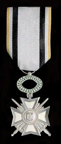 На ленту ордена за заслуги в военное время добавляется накладка в виде двух скрещенных мечей.