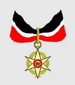 Лента ордена из трёх равновеликих полос чёрного, белого и красного цвета. К ленте офицера крепится розетка диаметром 28 мм из такой же ленты. Ширина ленты Большого креста — 101 мм, остальных степеней — 37 мм.