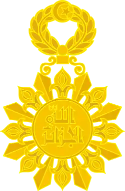 Знак ордена – восьмиконечная звезда с лучами в виде цветка лотоса, между которыми штралы в виде двугранного заострённого лучика. В центре круглый медальон с бортиком в котором надпись на арабском языке в две строки. Знак, при помощи переходного звена в виде венка из двух лавровых ветвей во главе которого круглый медальон с изображением полумесяца и пятиконечной звезды, крепится к орденской ленте.