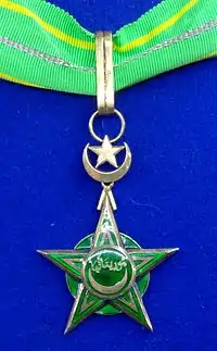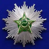 Знак ордена – пятиконечная звезда зелёной эмали с золотистым бортиком и внутренней каймой, наложенная на круг зелёной эмали с золотистым бортиков, выступающим между лучами звезды в виде штралов. В центре звезды круглый медальон зелёной эмали с золотистым бортиком. В медальоне золотой полумесяц рогами вверх, над которым надпись на арабском языке. Знак при помощи переходного звена в виде золотых полумесяца рогами вверх и пятиконечной звезды крепится к орденской ленте.