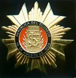 Звезда ордена — пятиконечный крест красной эмали с раздвоенными концами. Между плечами креста штралы, состоящие из разновеликих лучиков. В центре знака круглый медальон красной эмали с широкой каймой чёрной эмали. В медальоне изображение золотой решётки с вырывающимися языками пламени по бокам от неё. На решётку наложена монограмма «SL». На кайме надпись: вверху — «REPUBLICA DEL ECUADOR», внизу — «10 DE AGOSTO DE 1809».