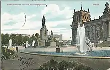 В конкурсе на проект памятника Бисмарку с участием более 90 человек победителя определить не удалось, и кайзер Вильгельм II поручил возвести памятник Бисмарку в восточной части Кёнигсплаца своему любимому скульптору Рейнгольду Бегасу. Ансамбль национального памятника высотой 15 метров с основанием в 20 на 12 метров возводился перед Рейхстагом в 1897—1901 годах. Его изначально украшали две полукруглые чаши фонтанов по бокам и скульптурные группы из песчаника тритонов и наяд работы Людвига Кауэра. Торжественная церемония открытия национального памятника Бисмарку состоялась 16 июня 1901 года.