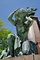 В общественном мнении того времени рейхсканцлер Бисмарк представал сверхчеловеком, и одна центральная скульптура не могла воплотить в бронзе его героизированный образ. Ещё четыре скульптуры на цоколе вокруг постамента раскрывали величие Отто фон Бисмарка. Титаническую силу Бисмарка и мировой масштаб его личности отражает образ коленопреклонённого атланта с земным шаром на плечах перед постаментом. Позади постамента Зигфрид на коленях выковывает имперский меч, которым Бисмарк подчинил врагов империи. С левой стороны цоколя Сивилла, аллегория государственной мудрости, восседает на спине сфинкса, обратив свой взгляд в книгу истории в левой руке, и олицетворяет духовное значение Бисмарка. С правой стороны цоколя властительница со скипетром и короной, предположительно аллегория Германии или государственного принуждения, усмиряет леопарда раздора и смуты, поясняя непобедимую мощь Бисмарка. Леопард является ранней работой ученика Бегаса Августа Гауля. После открытия новый национальный памятник подвергся критике. Ценителям искусства не понравились четыре боковые скульптуры и бронзовые барельефы по их качеству и по пропорциям образов.