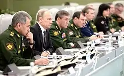 | Президент России Владимир Путин с руководством Минобороны России, апрель 2015 г. | Зал управления и взаимодействия НЦУО РФ. Повседневная служба | На связи с НЦУО РФ Центр по примирению враждующих сторон в Сирии, 27 февраля 2016 г. | Большой зал НЦУО РФ. Доклад руководителей региональных подразделений |