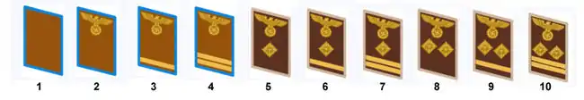 - Местные организации (Ortsgruppenleitung), светло-коричневые петлицы с голубым кантом, возможное высшее звание Oberabschnittsleiter (18)