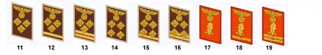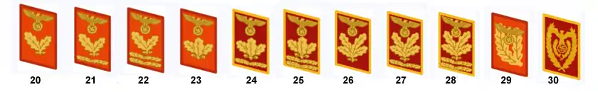 - Имперское управление (Reichsleitung), тёмно-красные петлицы с золотым кантом, возможное высшее звание Reichsleiter (30)