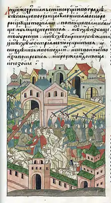 Горожане поверили и открыли ворота. Из города торжественно вышли князь Остей, духовенство, бояре и простые люди. Ордынцы же набросились на них и начали всех рубить. Взобравшись на никем не защищённые стены, татары принялись грабить всё и жечь. «И была в граде сеча зла и вне града тако же сеча велика. И до тех пор секли, пока руки и плечи их не ослабли и не обессилели они»[8]. Люди толпами метались по улицам, обречённо ища спасения. Татары взламывали двери церквей и выволакивали, грабя и раздевая «донага», укрывавшихся там горожан всех возрастов — от младенцев до глубоких стариков. Срывая драгоценные оклады и ризы с икон, татары топтали и надругались над образами святых и выносили всю церковную утварь. В огне погибло огромное количество книг, свезённых для сохранения в Москву со всех окраин. Была вывезена вся княжеская казна. Все люди были изрублены, сожжены, утоплены или уведены в рабство[14][10].