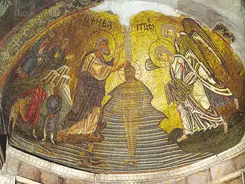 - Крещение Господне (мозаика находится в очень хорошей сохранности, повреждён только верхний фрагмент с изображением десницы Господней). Композиция включает в себя Иисуса Христа в крещатом нимбе, Иоанна Предтечу, двух ангелов и изображения нескольких людей из которых особо выделяется фигура юноши в нижнем левом углу, готовящегося прыгнуть в воду;