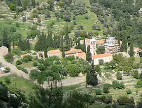 Монастырский ансамбль составляют кафоликон, две небольшие церкви (Креста Господня и великомученика Пантелеимона) и монашеские кельи. Его общая площадь около 1,7 гектара. Монастырь окружает стена XIX века, построенная вместо разрушенной в 1822 году стены византийской постройки.[2] Рядом с монастырём расположено кладбище для погребения монахов, на нём находится церковь преподобного Луки.[4]