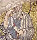 - Моление о чаше (мозаика находится в удовлетворительной сохранности). Композиция является редким примером иконографии данного евангельского сюжета. Кроме того изображение гефсиманского моления Христа редко встречается в монументальном искусстве до XII века[26]. Она включает в себя как собственно изображение молитвы Иисуса Христа, так и изображение сцены как Христос будит своих учеников. Изображение молящегося Иисуса сопровождает надпись с текстом его молитвы из Мф. 26:39. Цитата из Евангелия от Матфея также сопровождает изображение спящих апостолов и Иисуса;