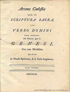 ![]() Arcana Cœlestia, первое издание (1749), титульный лист | |