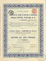 В Таганрог Альберт Нев прибыл в конце 1895 года, по настоянию своего дяди, влиятельного промышленника, директора предприятия «Société d’Ougrée» по производству стали в пригороде Льежа и Таганрогской Металлургической Компании — Густава Тразанстэра[3]. Там Нев руководил строительством административного здания компании «Альберт Нев, Вильде и К°»[3]. 23 апреля 1899 года были утверждены условия деятельности в России Бельгийского акционерного общества под наименованием «Анонимное Общество для эксплоатаціи машиностроительнаго и котельнаго заводовъ Альберт Невъ, Вильдъ и Ко въ Таганрогѣ». С которыми можно ознакомиться в Третьем собрании Законов Российской империи[6].
