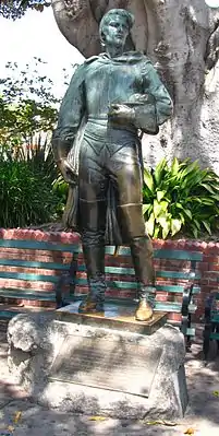 «FELIPE DE NEVE (1728-84). SPANISH GOVERNOR OF THE CALIFORNIAS 1775-82. IN 1781, ON ORDERS OF KING CARLOS III OF SPAIN, FELIPE DE NEVE SELECTED A SITE NEAR THE RIVER PORCIUNCULA AND LAID OUT THE TOWN OF EL PUEBLO DE LA REINA DE LOS ANGELES, ONE OF TWO SPANISH PUEBLOS HE FOUNDED IN ALTA CALIFORNIA.[5]»