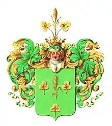 В зелёном щите золотой колос, сопровождаемый по бокам и внизу золотыми трилистниками.