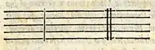 - у Зета Кальвизия в его учебнике «Музыкальный компендий для начинающих» (1602)[4] и в других учебниках ЭТМ. Знак невмы, который выглядит как одинарная или двойная тактовая черта классической 5-линейной нотации, перестал использоваться с установлением в Европе тактовой нотации.