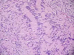 Невринома состоит из веретенообразных клеток с палочкоподобными ядрами. Клетки и волокна опухоли образуют «палисадные» структуры (ядерные палисады, тельца Верокаи) с участками, состоящими из волокон[29].