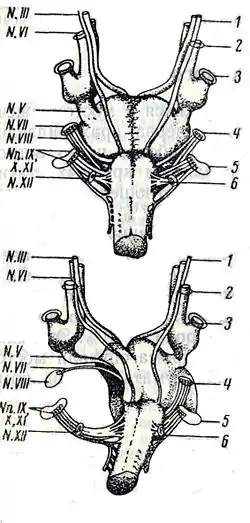 С поражением тройничного нерва также связывают угнетение роговичного рефлекса, слабость и атрофию жевательных мышц. Одновременно либо несколько позже появляются периферический парез лицевого и отводящего нервов на стороне опухоли. Раннее появление периферического пареза лицевого нерва наблюдается при невриномах, располагающихся во внутреннем слуховом проходе. Растущая опухоль встречает сопротивление костей слухового канала, что приводит к усиленному давлению на лицевой нерв. Клинически это сопровождается появлением пареза, потерей вкуса на передних двух третях языка и расстройствами слюноотделения[3][4].