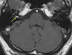 На МРТ выявляется ровный контур опухоли и по её периферии полоска сигнала так называемой «ликворной щели», деформация мозжечка и ствола головного мозга. При распространении невриномы во внутренний слуховой проход внекананальная её часть имеет вид «свисающей капли»[30].