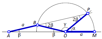 Треугольник BPO также равнобедренный, углы при его основании равны 2β, а угол при вершине γ = 180°–4β. С другой стороны, γ = 180°–β–α. Следовательно, 180°–4β = 180°–β–α и α = 3β.