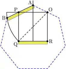 Построим квадрат PQRO со стороной a (рис. 5). Проведём дугу окружности с центром O и радиусом OQ. Возьмём линейку невсиса с диастемой (длиной) a и используя вертикальную ось симметрии квадрата в качестве направляющей, точку P в качестве полюса и дугу окружности в качестве целевой линии, получим отрезок AB, который будет стороной правильного семиугольника, с вертикальной осью симметрии, совпадающей с осью симметрии квадрата.