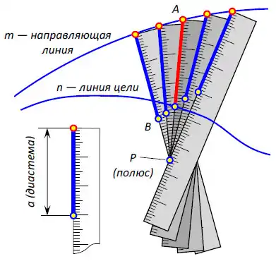 Прижимая линейку к булавке, начинаем двигать точку А по кривой m так, чтобы точка B приближалась к кривой n.