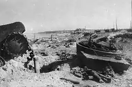 Ни одного деревца или куста, ни одного кирпича на кирпиче — всё снесено огнём… Всё это на фоне постоянного грохота нашей и немецкой канонады, специфического запаха минного пороха, отвратительного звука немецких штурмовиков, стона раненых, мата живых, кроющих немцев, войну и этот гиблый пятачок, а иногда и наших артиллеристов, лупивших по своим позициям.