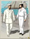 Слева член Комитета Невского яхт-клуба в белом костюме. На рукавах знаки различия члена комитета. Справа матрос судна Невского яхт-клуба в белой форме. На рукаве знак за службу на данной яхте или у данного судовладельца свыше 4-х лет.