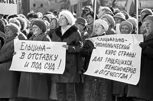 Невыплаты пенсий и социальных пособий в России в 1990-е годы во время проведения экономических реформ стали массовым явлением наряду с невыплатами зарплат. К началу 1997 года задолженность по пенсиям достигла 17 трлн неденоминированных рублей, по выплате пособий на детей — около 10 трлн рублей, пособий по безработице — около 2 трлн рублей[1].