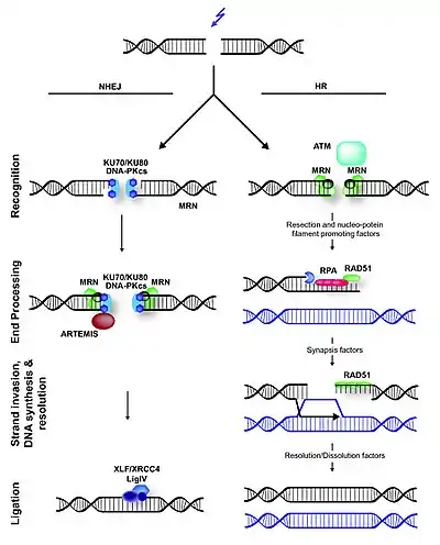 В отличие от бактерий, эукариотический NHEJ использует обширный ряд белков, участвующих в осуществлении следующих шагов[15]: