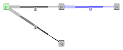![]() Диаграмма состояний автомата M. Он не является детерминированным, поскольку из состояния p чтение 1 может привести в p или в q. |