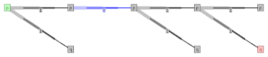 - Если рассмотреть второе из формальных определений, проход снизу вверх показывает, что , следовательно, , а тогда , откуда , и, наконец, . Поскольку это множество содержит , строка «1011» принимается.