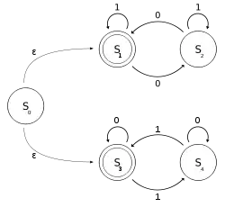 можно рассматривать как объединение двух ДКА — один с состояниями , а другой с состояниями . Язык можно описать как регулярный язык, заданный регулярным выражением (1*(01*01*)*) ∪ (0*(10*10*)*). Мы определяем с помощью ε-переходов, но можно определить и без них.
